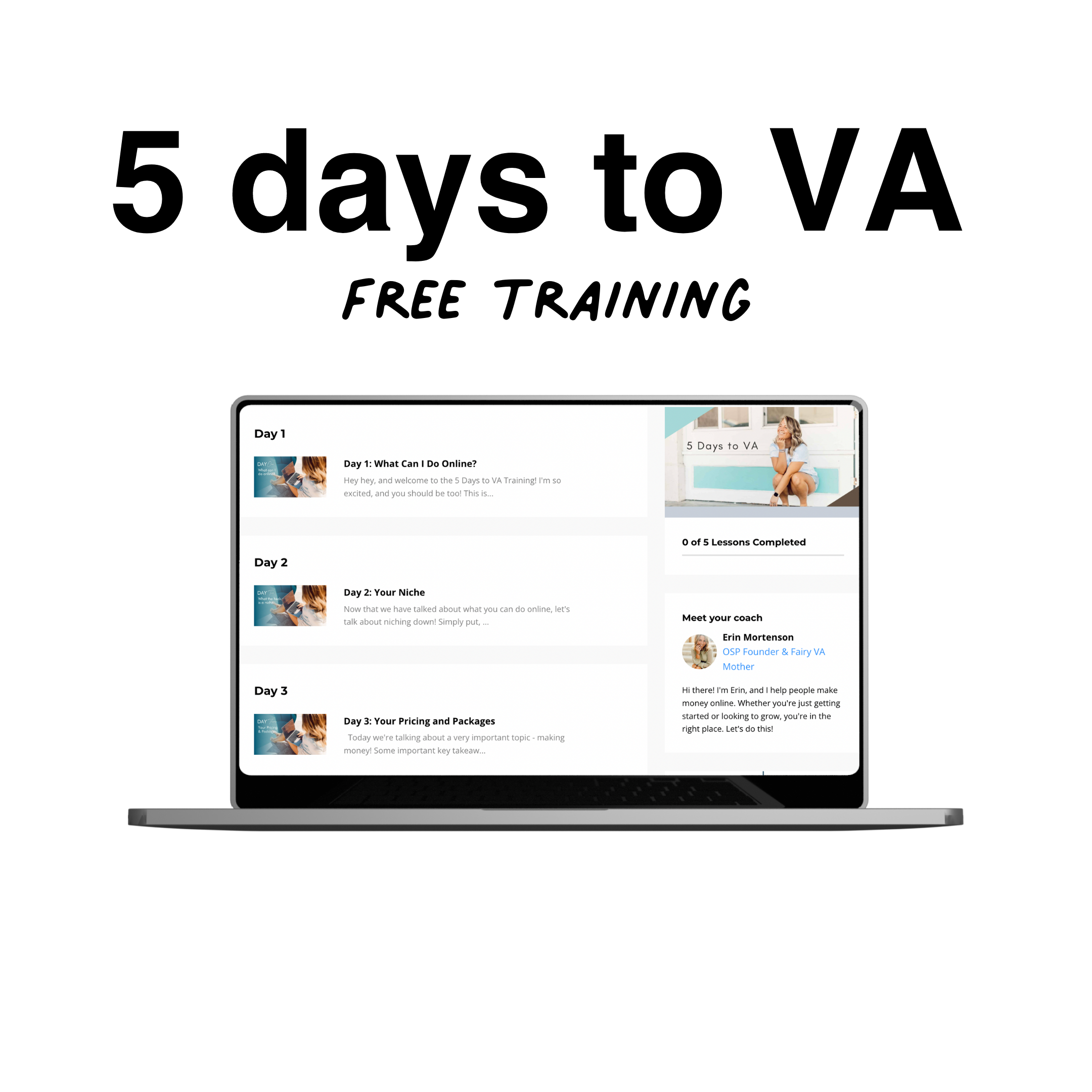Learn what it’s all about! In this absolutely free 5 day training, Erin will teach you all about the different types of online service based businesses you can start (with the skills you already have!), how to create your services and offers, how to find clients, and how to get going. This is for anyone who is curious about wanting to work online, and doesn’t know where to start.